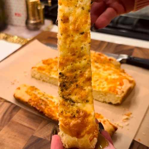 Then, lift the breadsticks out of the pan and slice them into even pieces. Serve warm with marinara sauce for dipping.